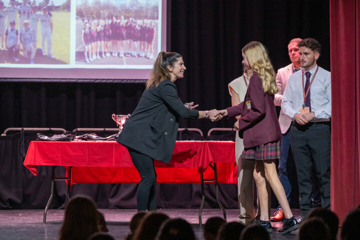 In addition to Jenna's talk, we enjoyed a fantastic dance performance from Miss Gaffney's Year 11 class and awarded students with their Sports Colours. Sports Colours are given in recognition of the commitment, resilience and positive attitude of all our students who have represented the school in a sporting activity or been given an Athlete of the Month award by their PE teacher. Prizes were also given out for our Team of the Year from last year, the Year 7 and 8 Girls' Football Team, and our MVPs (Most Valued Performer).